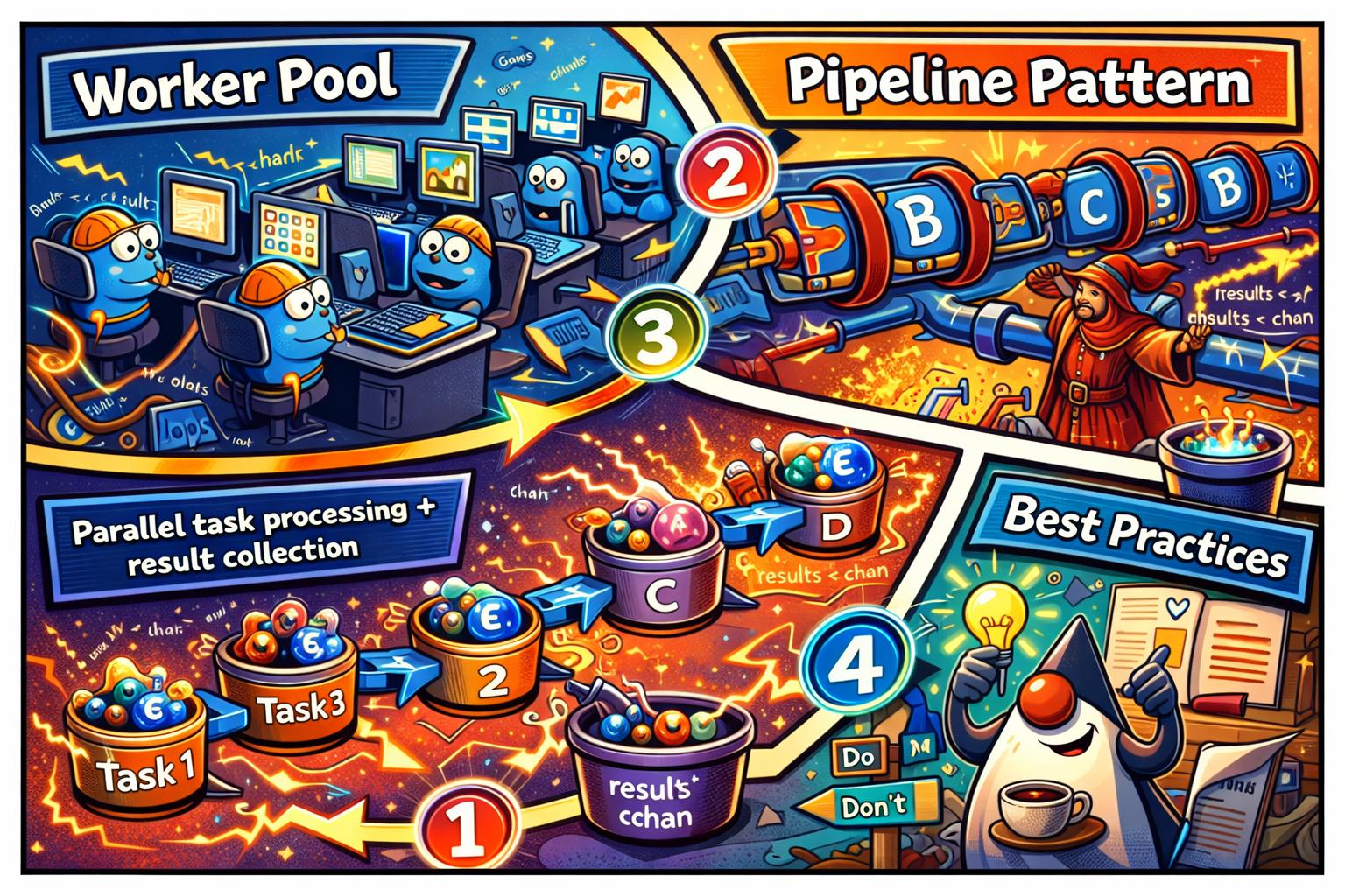 В этой части мы рассмотрим практические паттерны параллельной обработки задач: worker pool, pipeline pattern и схемы сборки результатов. Эти паттерны помогают повысить производительность и избегать deadlocks.